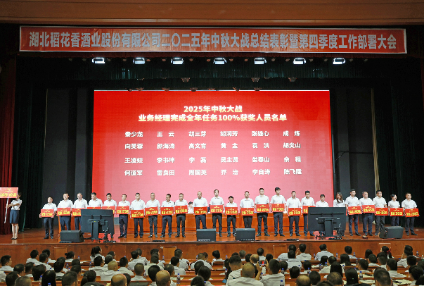 大会现场 10月11日,稻花香酒业2025年中秋大战总结表彰暨第四季度工作部署大会在稻花香大礼堂举行,总结中秋战绩,表彰营销先进,凝聚全员合力,锚定四季度任务再提速、再加压、再发力,推动市场量级全面提升,夯实决胜全年基本盘。 2025年,是稻花香推进“四个全面提升”的开局之年。自8月份打响中秋大战以来,稻花香营销铁军聚合力、谋创新,湖北大区锚定核心稳根基,省外南区聚焦重点拓增量,省外北区整合资源提效能,全国市场一盘棋,抢抓中秋国庆双节机遇,订货会、答谢会、联谊会等如火如荼举行;针对婚宴、团圆宴、商务宴请等特定场景开展专项营销;携手CCTV军事频道传递美好祝愿,系列广告覆盖高铁、地标大屏及核心社区,广泛触达目标消费者……一系列营销举措精准落地,实现产品销量和品牌声量双提升。