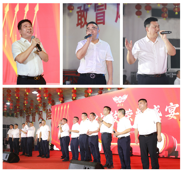 营销人员上台表演 稻花香酒业销售公司高层与各大区负责人也纷纷登台展艺,共享欢乐时光。稻花香酒业公司副总经理兼销售公司总经理罗贤强一曲《稻花赞》引发全员大合唱;湖北大区、省外南区、省外北区负责人相继献唱《朋友》《上海滩》《风雨无阻》等经典曲目,唱出了营销人的心声,台下营销将士挥臂应和,声浪如潮。各分公司员工也纷纷带来节目,《把酒倒满》《不再犹豫》《天地龙鳞》《海阔天空》《光阴的故事》《涛声依旧》《搀扶》等表演精彩纷呈,台上台下互动热烈,将晚宴氛围推向一个又一个高潮。