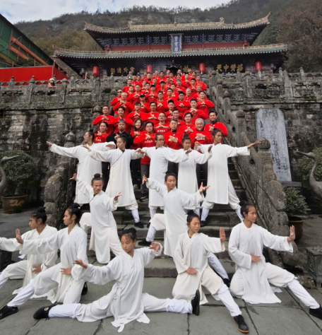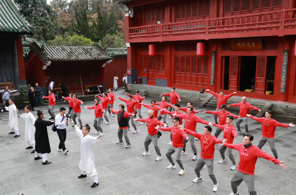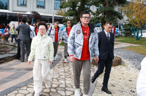 “左脚开步,气沉丹田……” 在紫霄宫的庭院中,武当道长的悉心指导下,平日里在绿茵场驰骋的明星们,此刻整齐列队学起了太极。谭咏麟跟着节奏缓缓抬手、转身,动作虽略显生疏却格外认真,还不时与身旁的人互相比划;大家一招一式颇有侠者风范,引得道长连连称赞 “有武学天赋”;明星们学得一丝不苟,边学边向道长请教发力技巧,纷纷打趣道:“学好太极说不定能提升赛场灵活性!”精彩的太极与武术表演更是让明星们目不暇接,掌声此起彼伏,表演结束后,大家在台阶上与表演者合影,定格这难得的 “仙山侠影” 瞬间。 体旅融新篇 活力盛宴绽放
