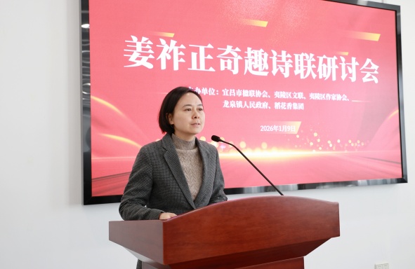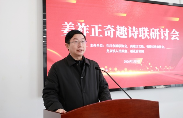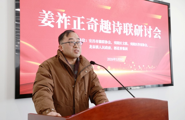 研讨会现场 此次活动由宜昌市楹联协会、夷陵区文联、夷陵区作家协会、龙泉镇人民政府、稻花香集团联合主办。来自深圳市长青诗社、宜昌市及夷陵区文艺界、龙泉镇政府、稻花香集团的50余位代表齐聚一堂,以诗为媒、以酒传情,多方共话诗联艺术、文化传承与文学创新。 据了解,今年92岁高龄的姜祚正先生是从夷陵区龙泉镇走出的文化名家,有着“诗书两绝技,华夏一奇人”的美誉,已推出七本奇趣诗联专著,并创立五十多种诗体。2025年,经宜昌、深圳两地作家和学者联手,编纂《姜祚正的奇趣人生》新著并公开出版,此次研讨会即以此为契机举行。