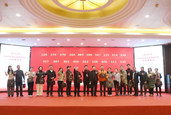 获奖人员合影留念 在随后举行的“活力之夜”2026年湖北省食品产业迎新春晚宴上,行业同仁们欢聚一堂,在温馨喜庆的氛围中共话友谊、畅享未来。湖北大鼓以其浓郁的地方风情拉开文艺演出的序幕,《龙船调》《暗里着迷》《月半小夜曲》《我爱你中国》《祝福你中国》等歌曲或深情款款,或大气磅礴,将现场气氛推向了高潮。晚宴还穿插了激动人心的抽奖环节,稻花香现场送出40份馫香型白酒礼盒,满载着湖北特色食品的醇厚情谊,为本次大会画上圆满句号。 (文/图 王佩佩 蔡喆 大会图片直播)
