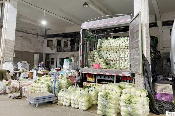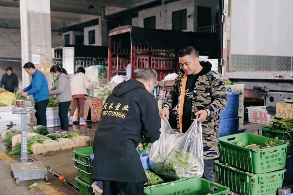 在蔬菜区隆源蔬菜档口,白萝卜、白菜、西红柿等菜品摆放整齐。老板郑家应正忙着清点货物,指挥装车。他从正月初三便开门营业,近两日商超和批发商采购量明显增加,销量稳步上升。