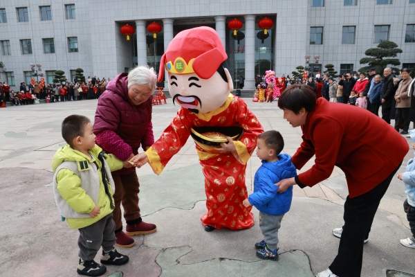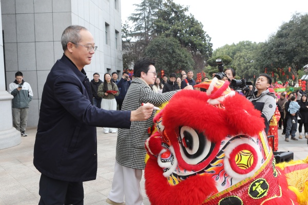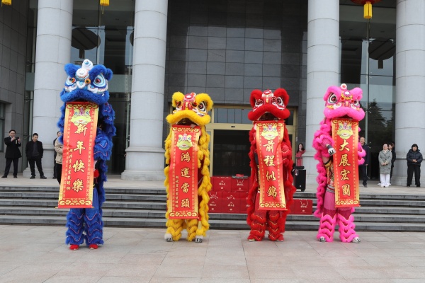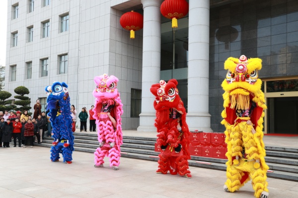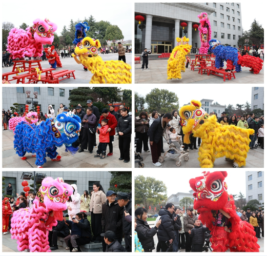 伴随着激昂欢快的鼓点,4只威风凛凛的雄狮时而摇头摆尾,憨态可掬;时而探入人群,热情互动;时而攀凳跃起,在高处昂首拜年、转身直立,动作行云流水、刚劲有力。与此同时,两位笑容可掬的“财神爷”抱着金元宝,一路撒糖送福,大家争相接住这份甜蜜的“财气”,现场洋溢着企地同乐、喜庆祥和的节日氛围。