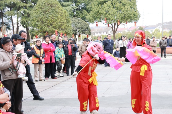 乡音一起,地花鼓热闹登场。演员们左手的红手绢在指尖飞速旋转,如朵朵红花绚丽绽放;右手的彩扇翻飞如蝶,送出春风满面。质朴诙谐的俚语演绎出新春的喜悦,原汁原味的乡土艺术让现场观众倍感亲切,掌声不断。