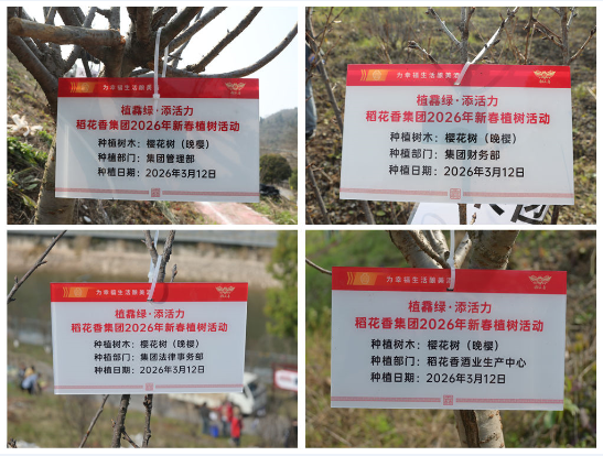 根植沃土,静待花开。此次活动共种植600株晚樱树苗,直径4-5厘米、高约1.5米。种植的晚樱树苗上悬挂了责任牌,建立树木档案,标注了品种、责任人/部门、种植日期等信息,让树苗有了“身份证”,赋予其生命的意义,也系紧了稻花香人与这片土地的情感纽带。后期,相关责任人和责任部门将定期巡查和保养,确保每一棵树苗都能茁壮成长。未来,这些晚樱将在这里扎根、生长、开花,见证龙泉湖的四季更迭,也见证稻花香在高质量发展的道路上步履铿锵。
